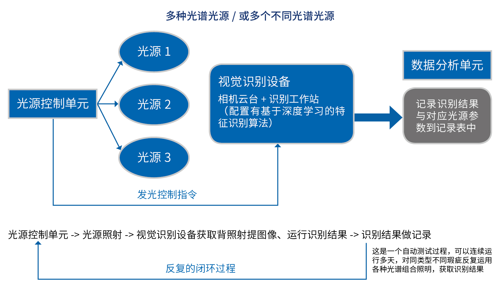 光源調(diào)整包括對同一多光譜光的不同光譜段發(fā)光控制,以及多個不同單光譜光源的順序、隨機亂序發(fā)光控制,獲取最大不同光譜照明組合數(shù)的光源照明圖像結(jié)果;經(jīng)過一段時間運行,對所有光源照射效果的所有組合控制獲取多輪數(shù)據(jù),數(shù)據(jù)分析單元通過對識別結(jié)果記錄表的數(shù)據(jù)統(tǒng)計和分析,給出視覺場景的理想光源照射結(jié)果排序,以及相應(yīng)光源參數(shù)顯示。
